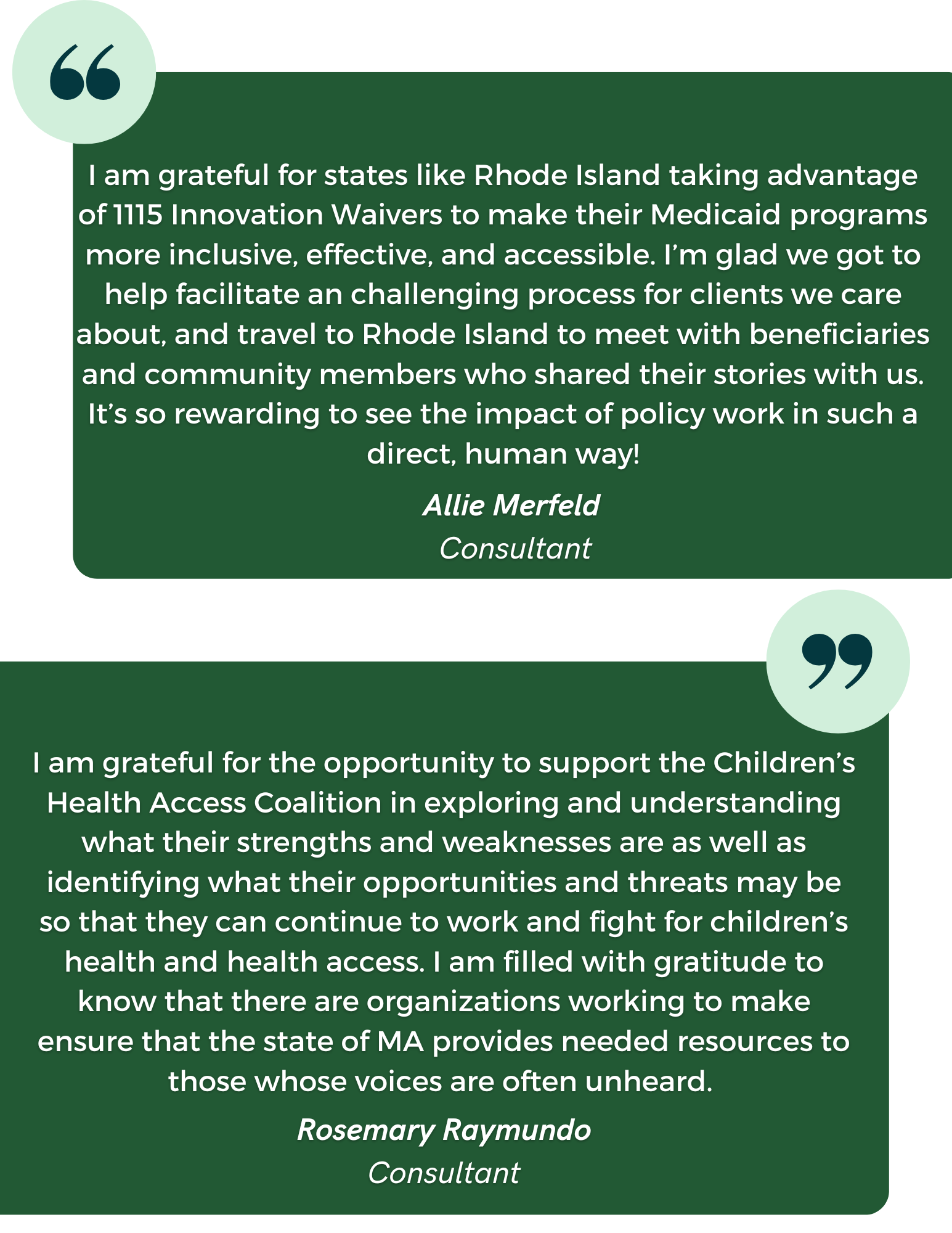 My team and I are energized by our clients and the work we have done together this past year. From assisting State-Based Marketplaces in expanding access to affordable coverage to working with community health centers to shift to value-based care, we are grateful for being able to play a role in transforming the healthcare system to be more equitable, affordable, and accessible.